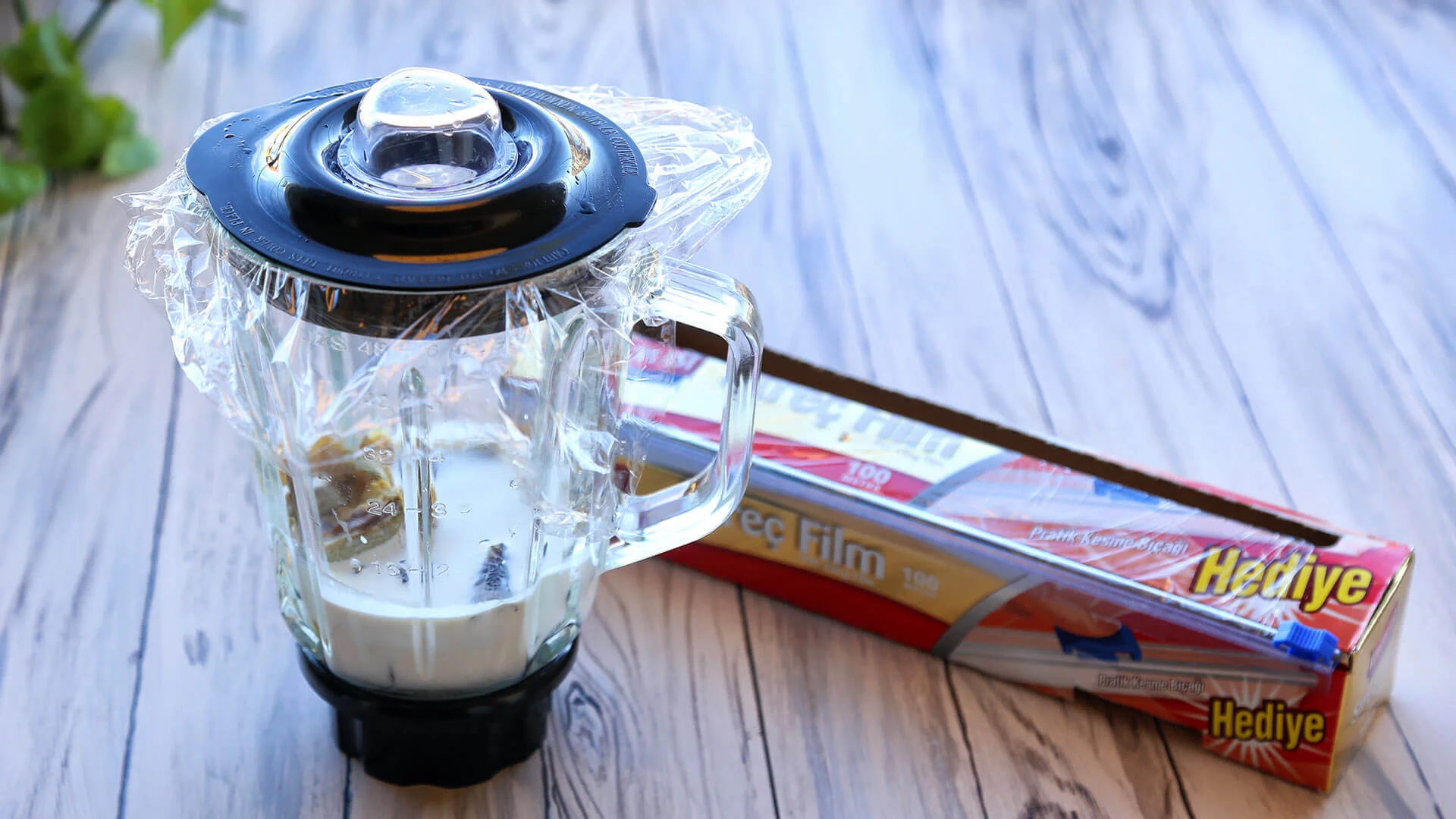 - Mutfak robotunun ağzını streç filmle kaplayın.